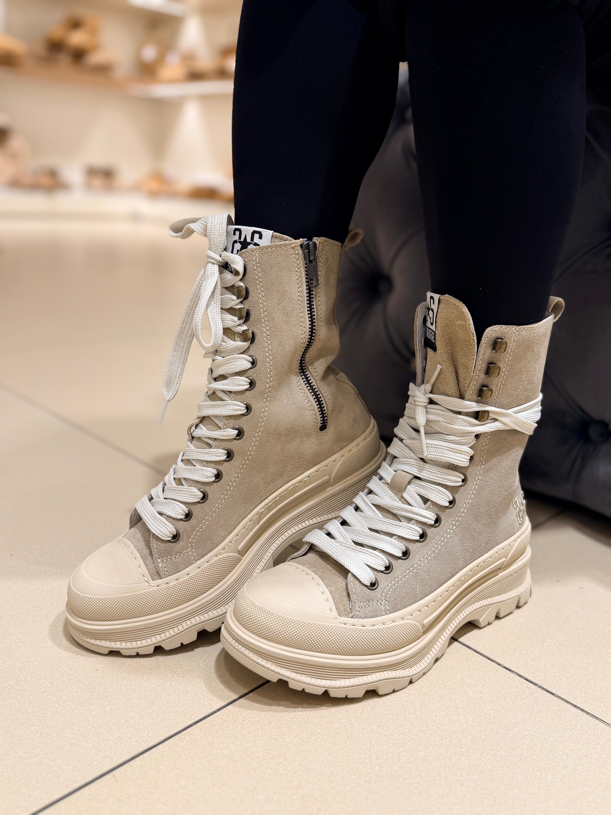 Sneakers stivaletto con lacci e cerniera laterale, beige in camoscio