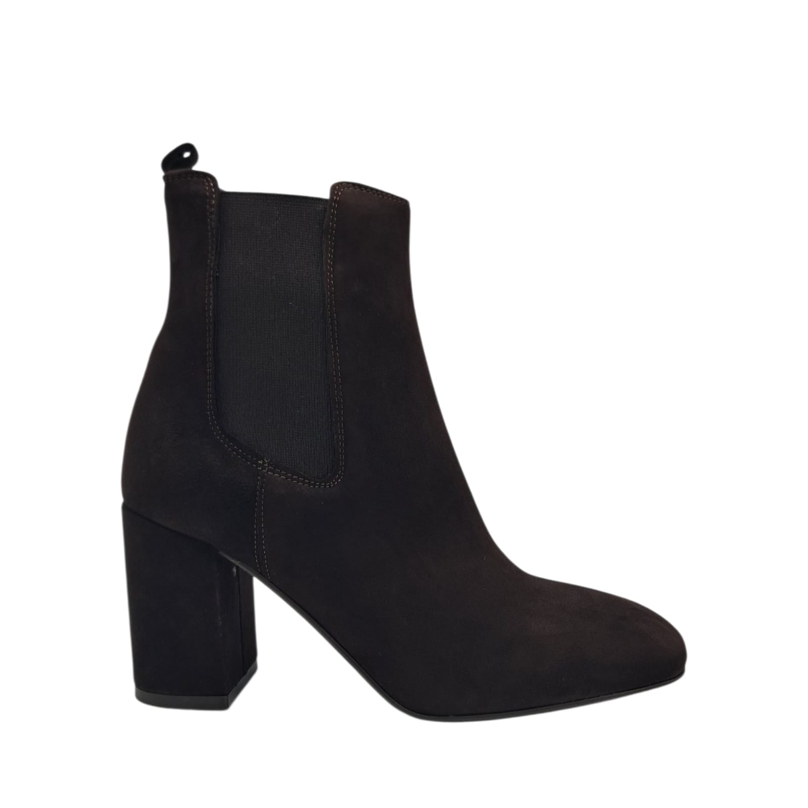 Tronchetto in camoscio testa di moro con elastici laterali, tacco largo 8 cm