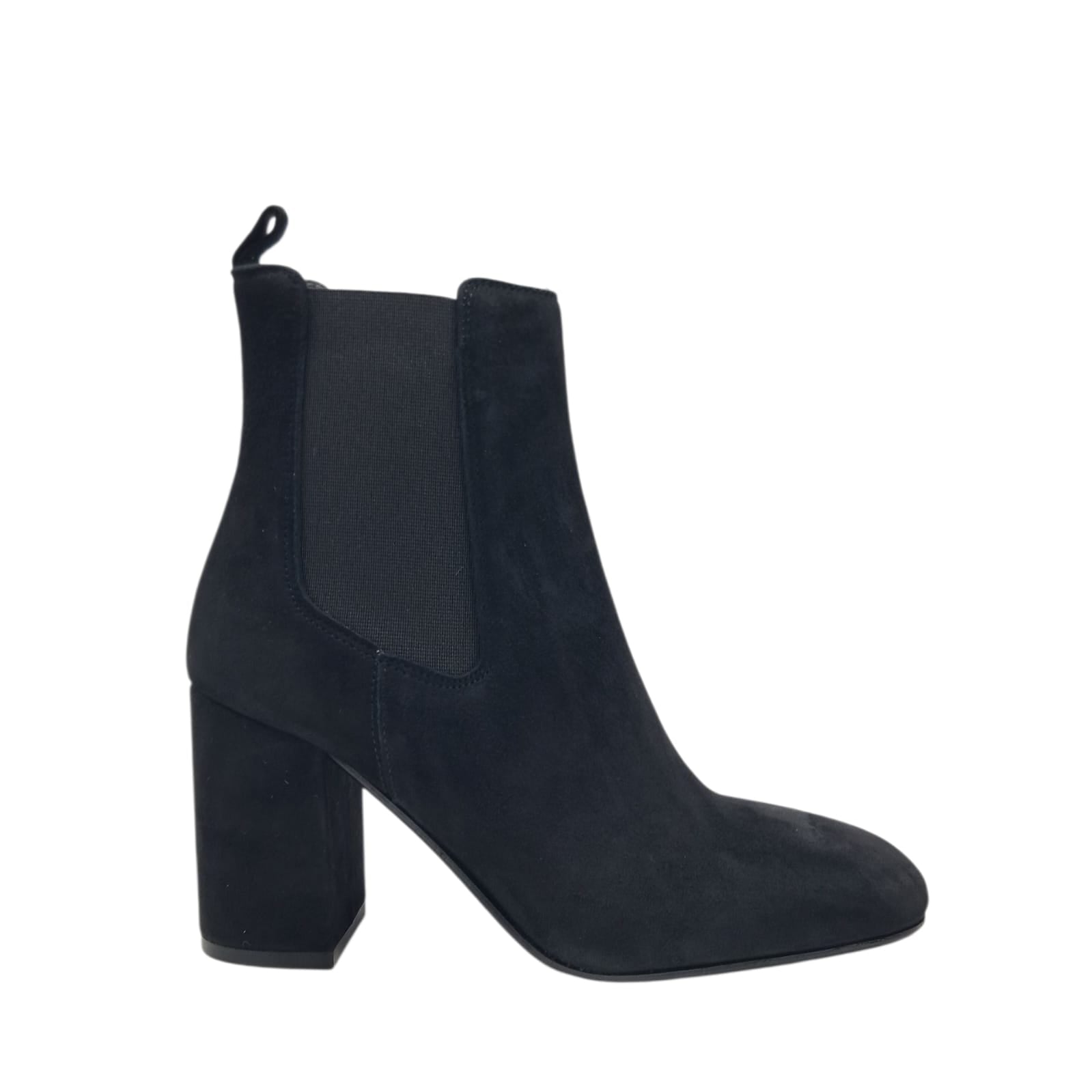 Tronchetto in camoscio nero con elastici laterali, tacco largo 8 cm