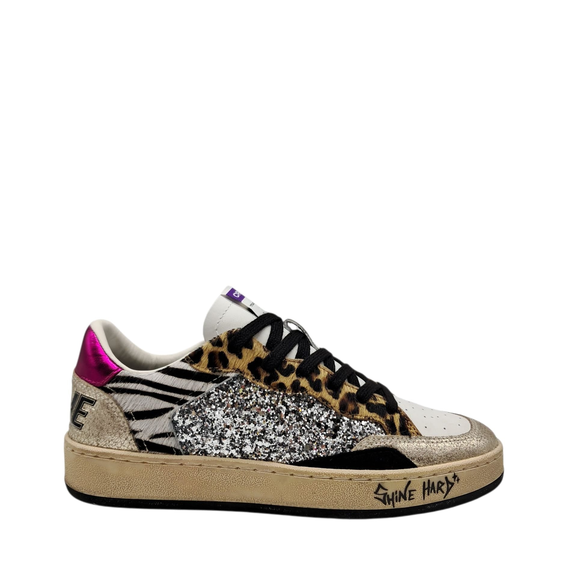 - Tomaia in glitter argento, dettagli in cavallino leopardato