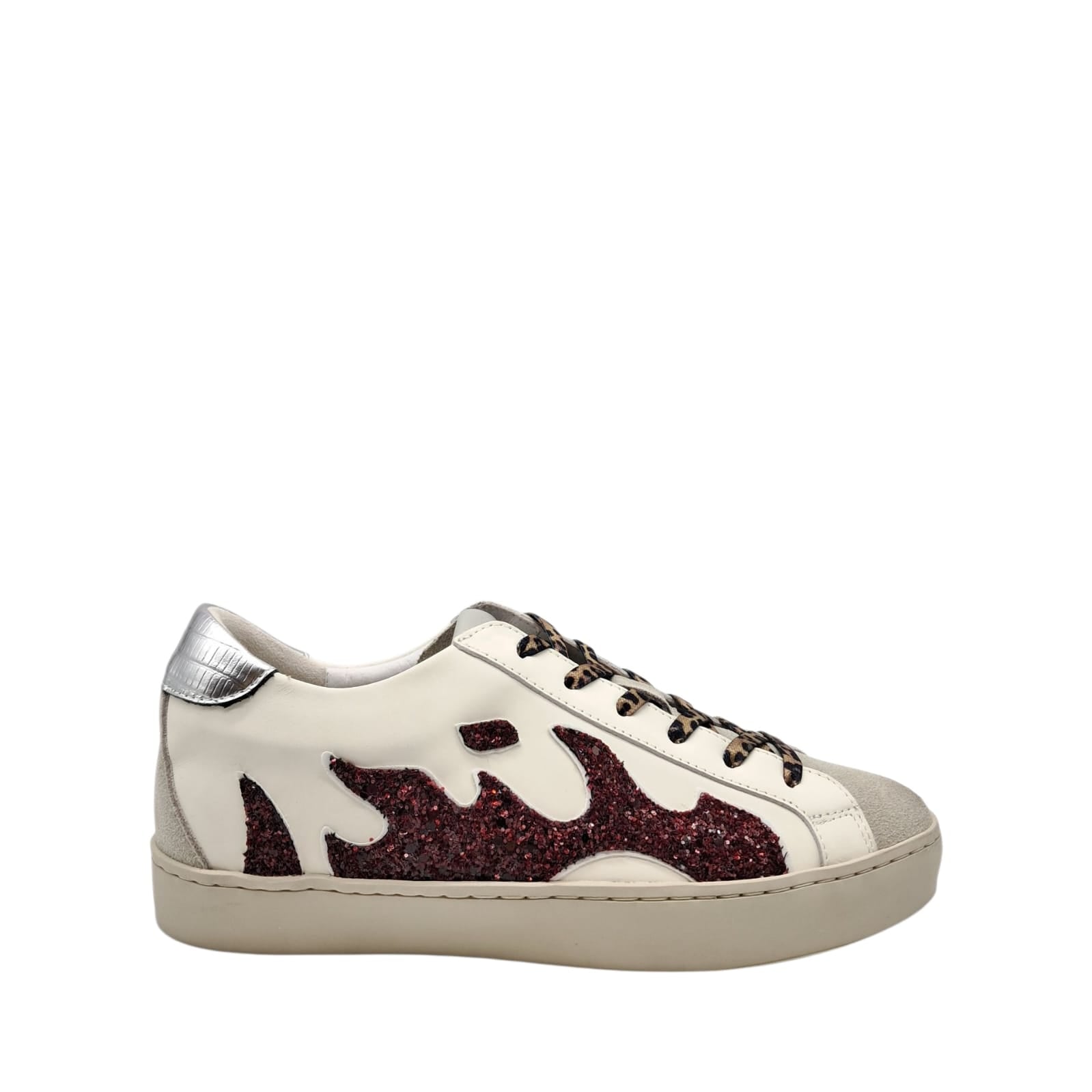 Sneakers in pelle e camoscio con dettagli glitter bordeux e lacci animalier