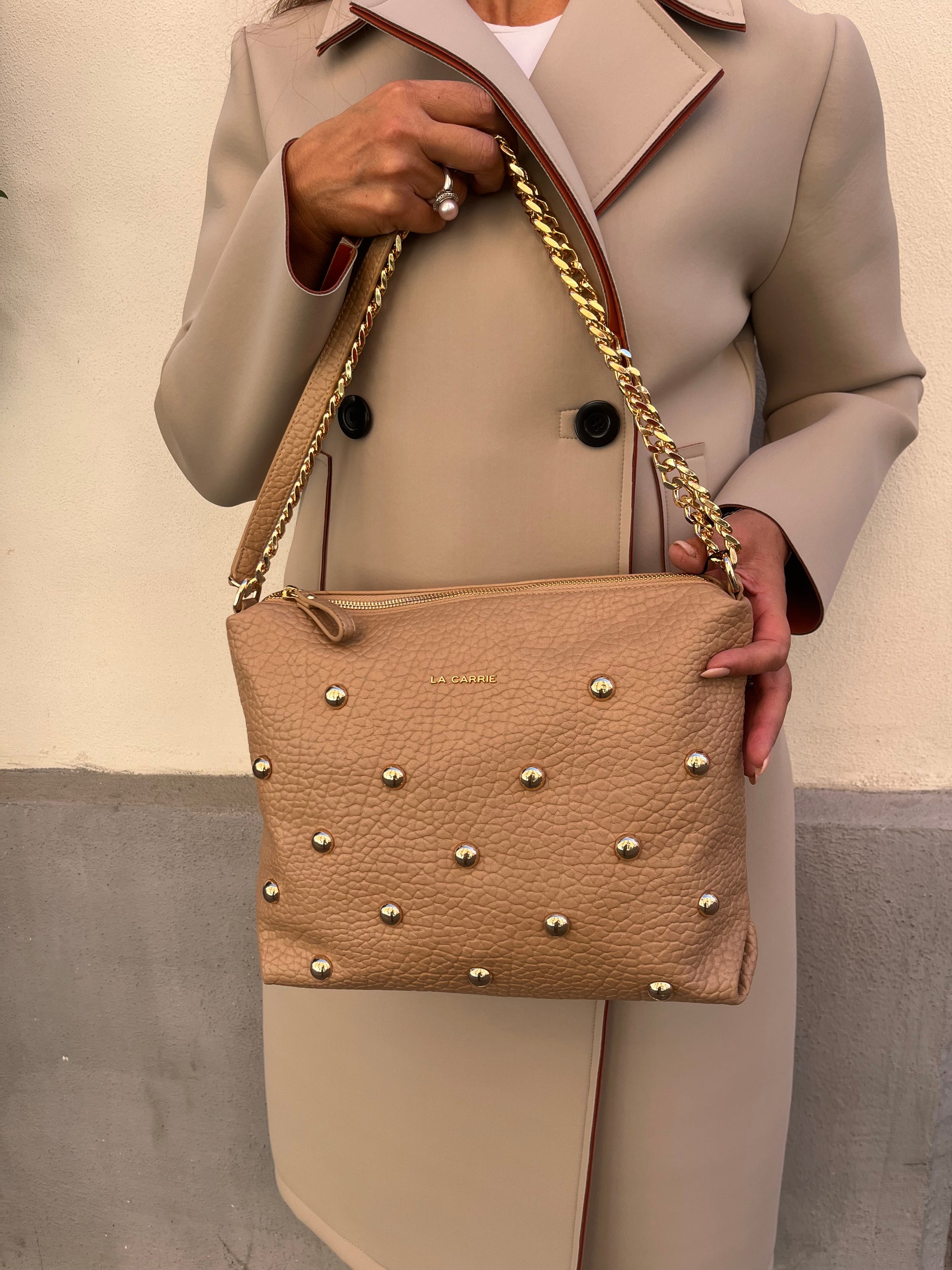 Borsa in pelle martellata con borchie a sfera dorate e doppio manico a tracolla