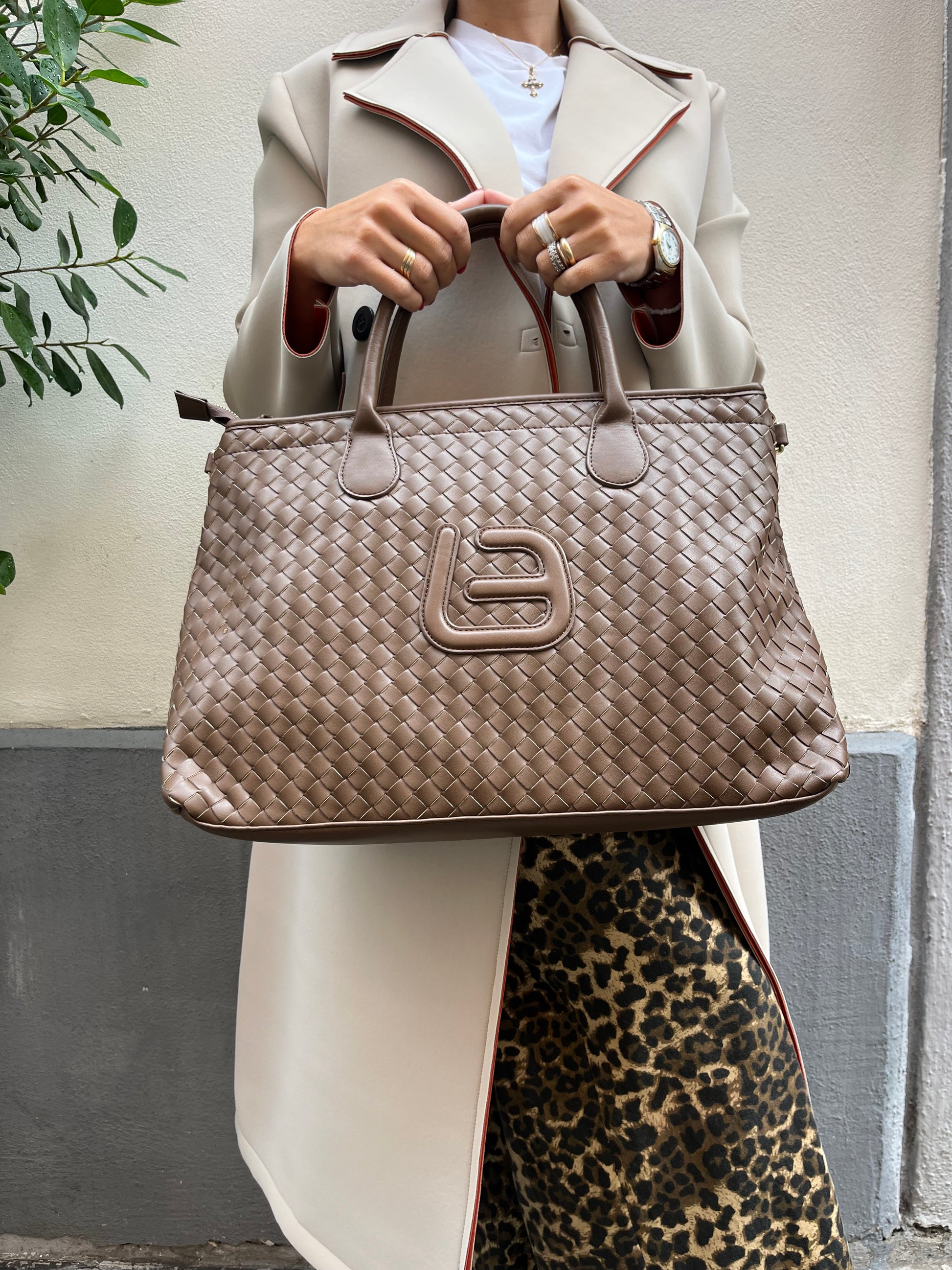 Borsa shopping ecopelle intreccio, testa di moro, tracolla interna