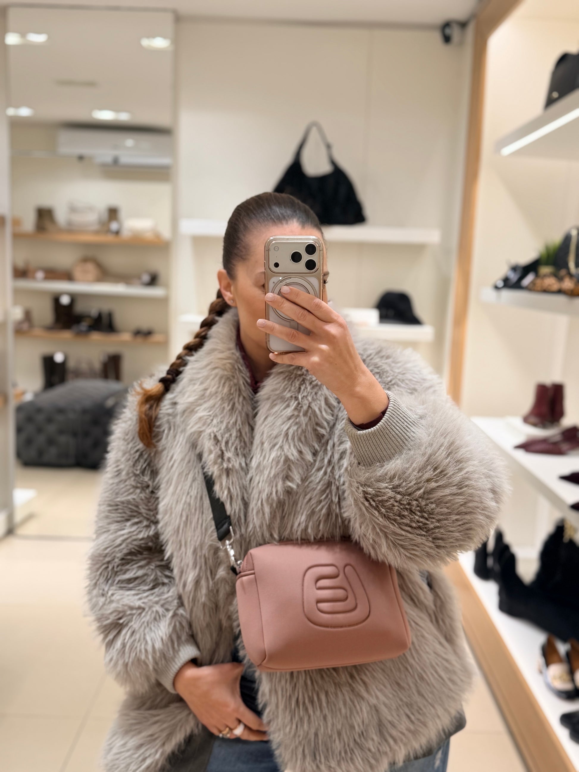 Borsa in neoprene rosa secco con tracolla in tessuto regolabile