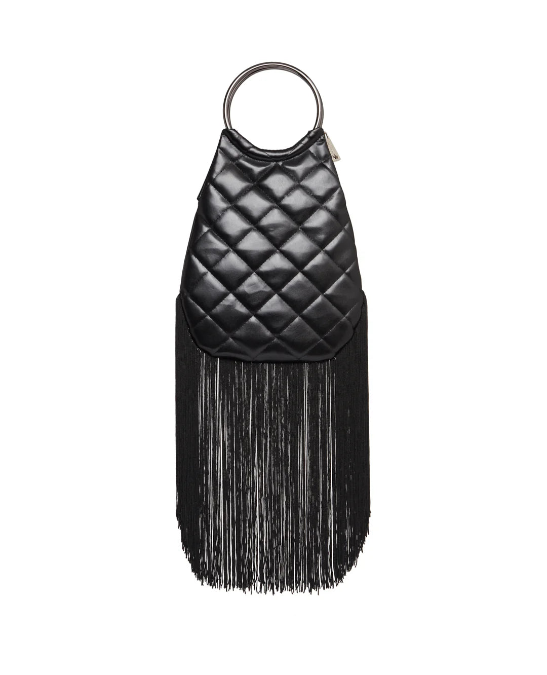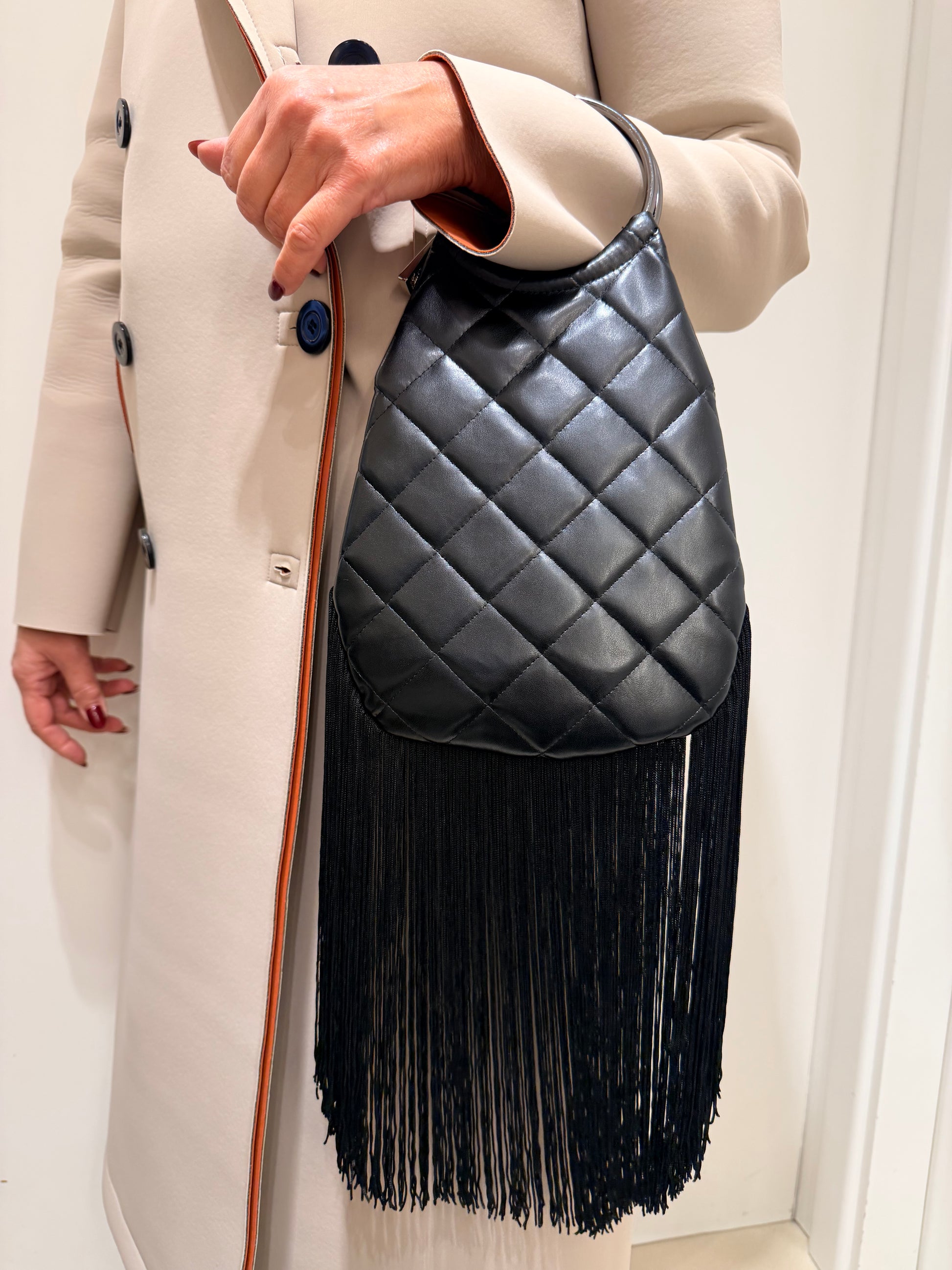 Borsa a mano donna in ecopelle nera trapuntata con frange lunghe. I manici rigidi ad anello donano un tocco moderno, mentre le frange creano movimento e stile. Perfetta per outfit glamour e serate speciali.