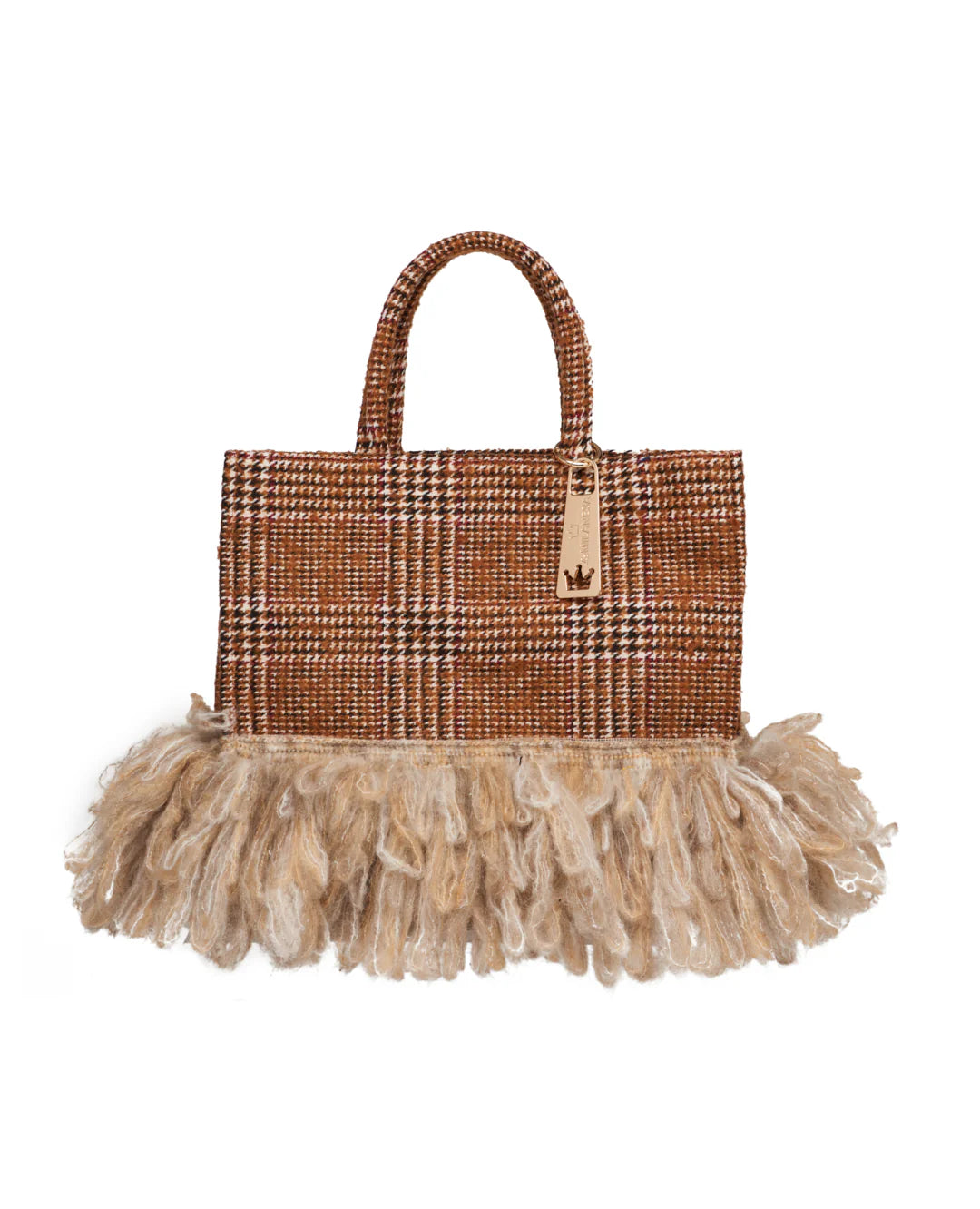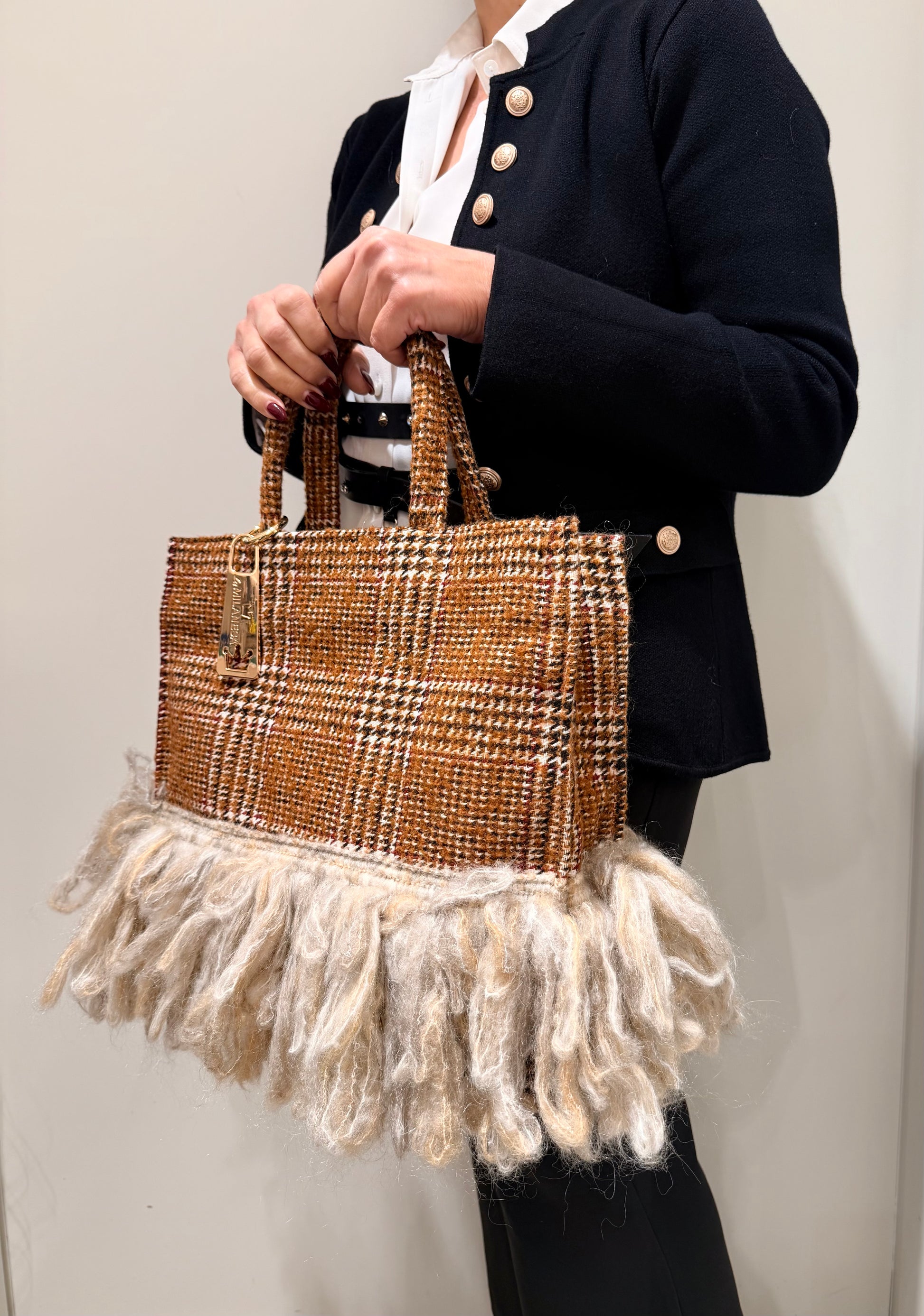 Shopping bag in tweed marrone a quadri con frange in lana sul fondo. Strutturata e distintiva, dona carattere anche agli outfit più semplici.