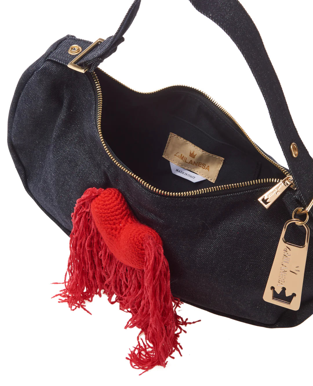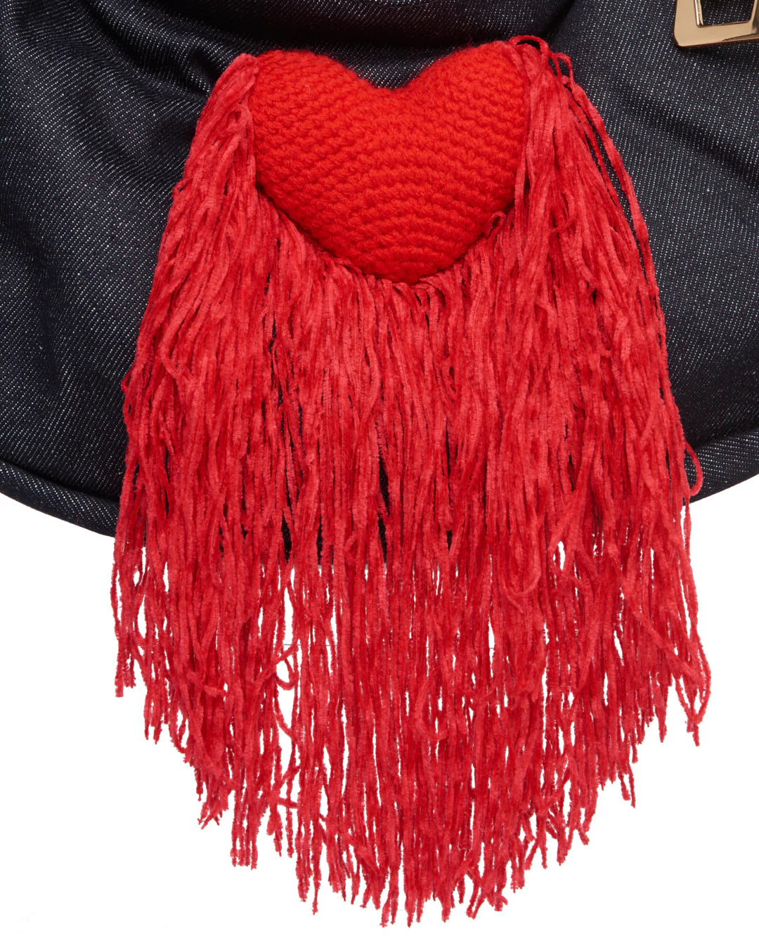 Borsa hobo in denim blu con dettaglio applicato: cuore crochet rosso e frange abbinate. Originale e vivace, unisce lo stile casual del denim con un tocco artigianale romantico.