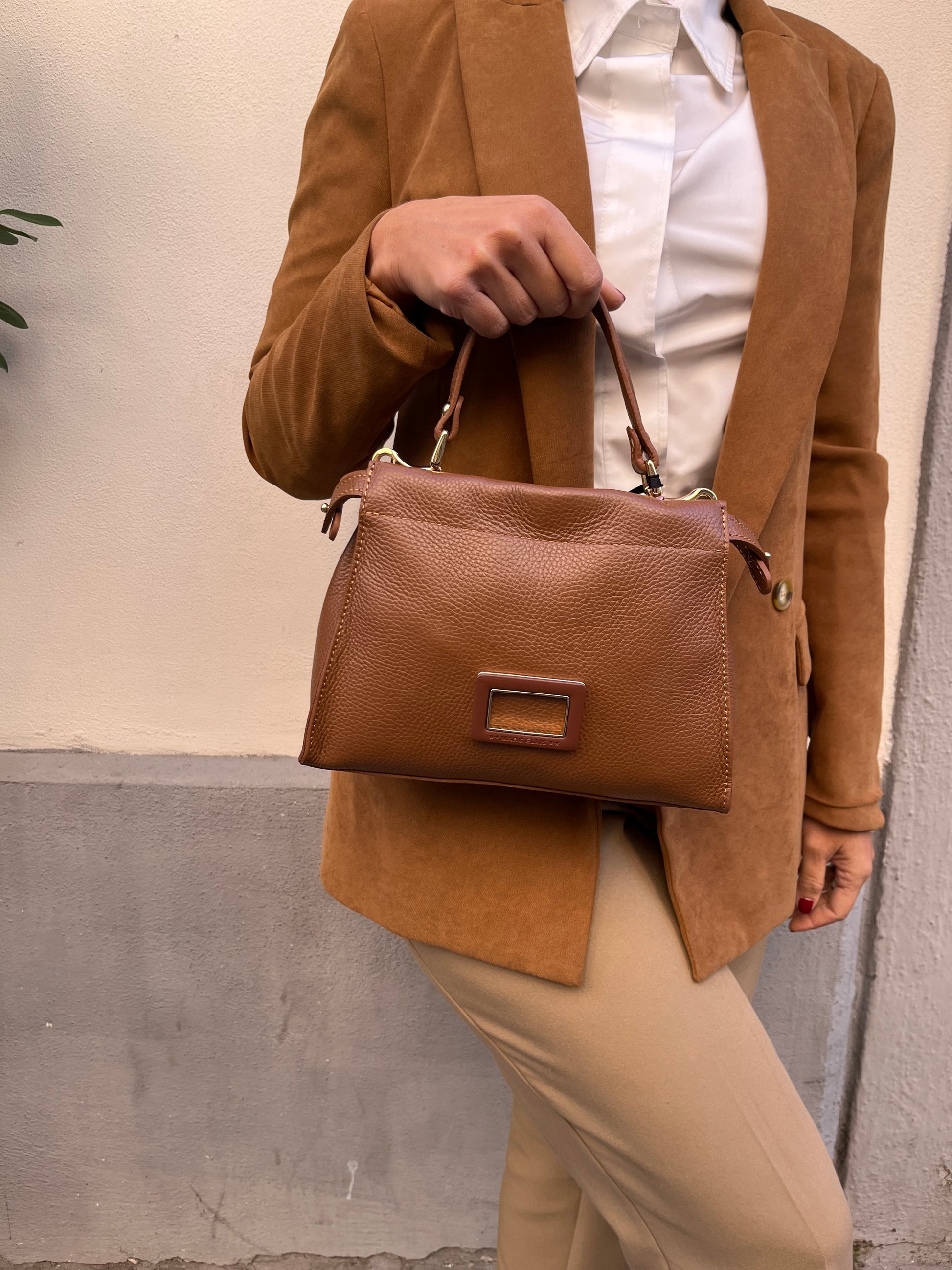 Borsa in pelle marrone e dorata con doppia apertura e tracolla