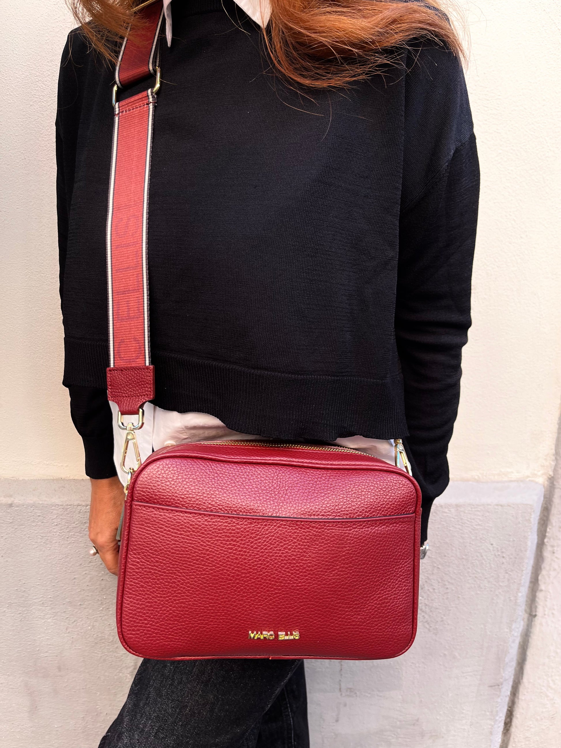 Borsa rettangolare bordeux con tracolla in tessuta e apertura doppia con cerniera