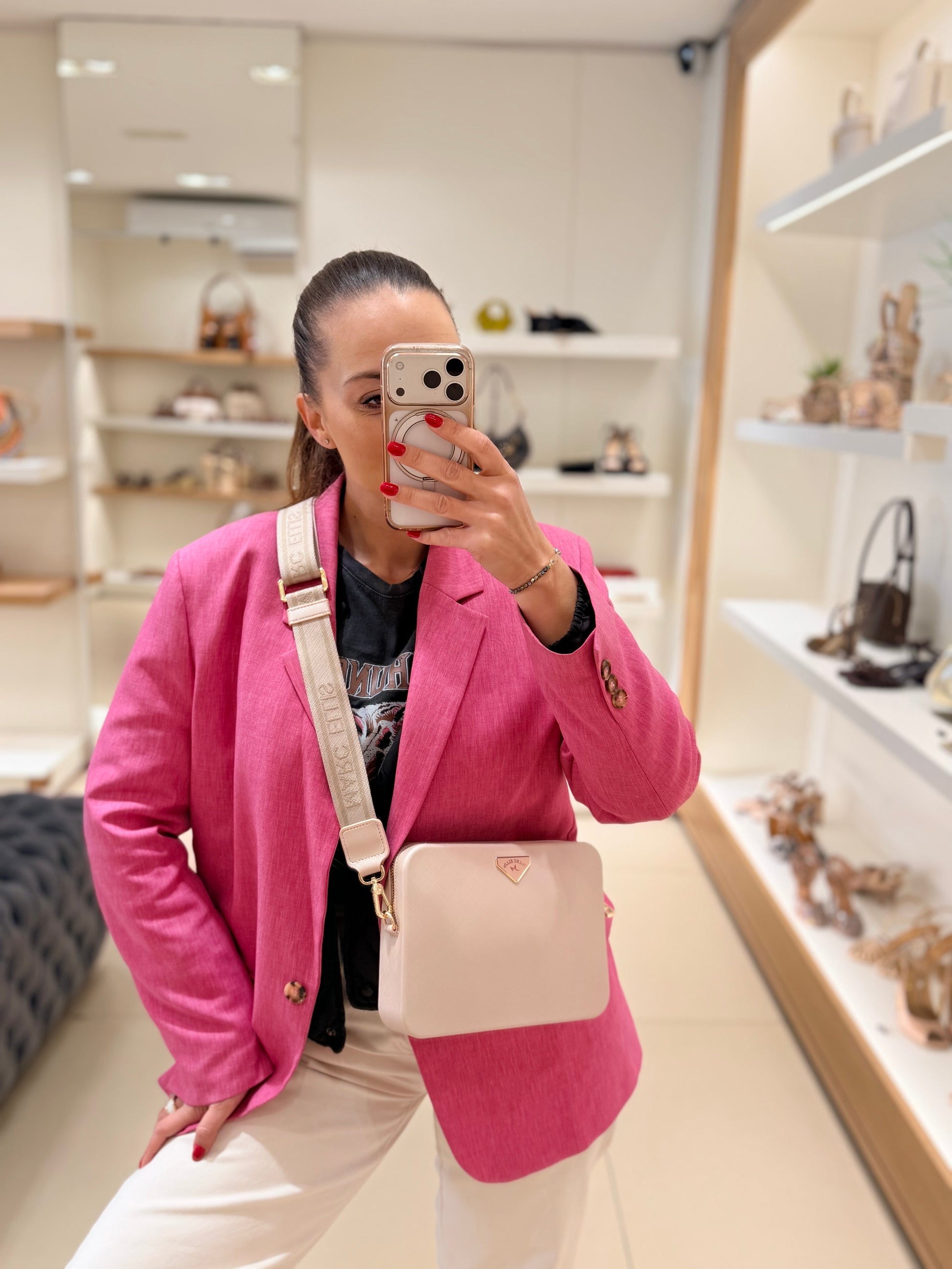 Borsa ecopelle a scatolina, con tracolla in tessuto regolabile e Polsiera removibile