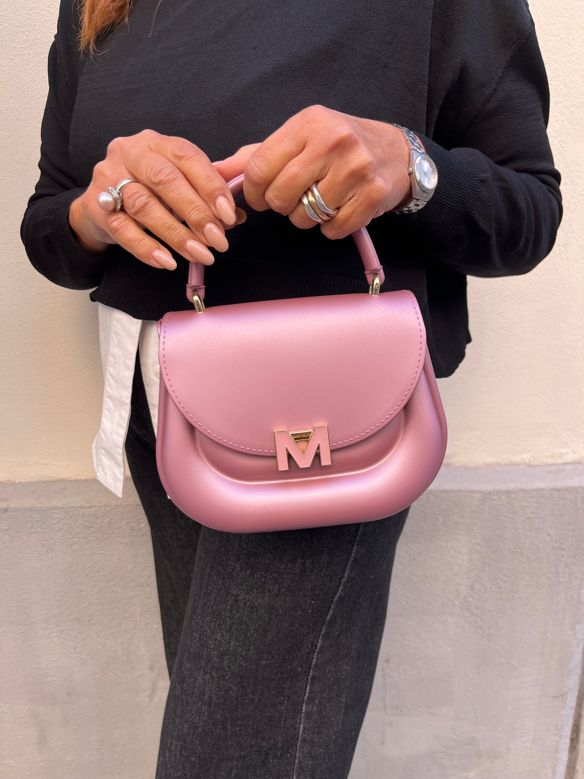 Borsetta gommata rosa con dettagli dorati e tracolla in tessuto