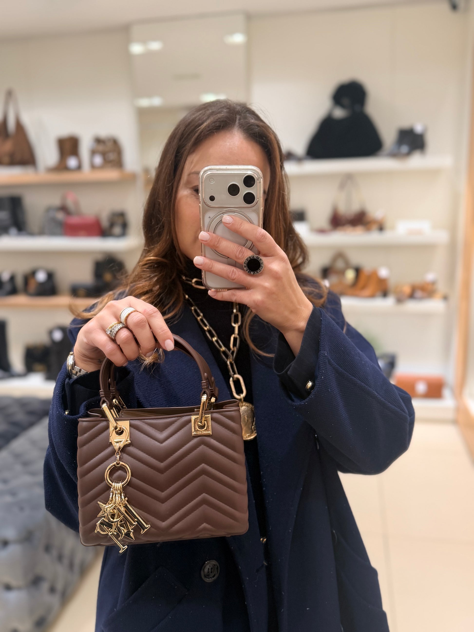 Borsa gommata marrone con charms dorati e tracolla in tessuto regolabile