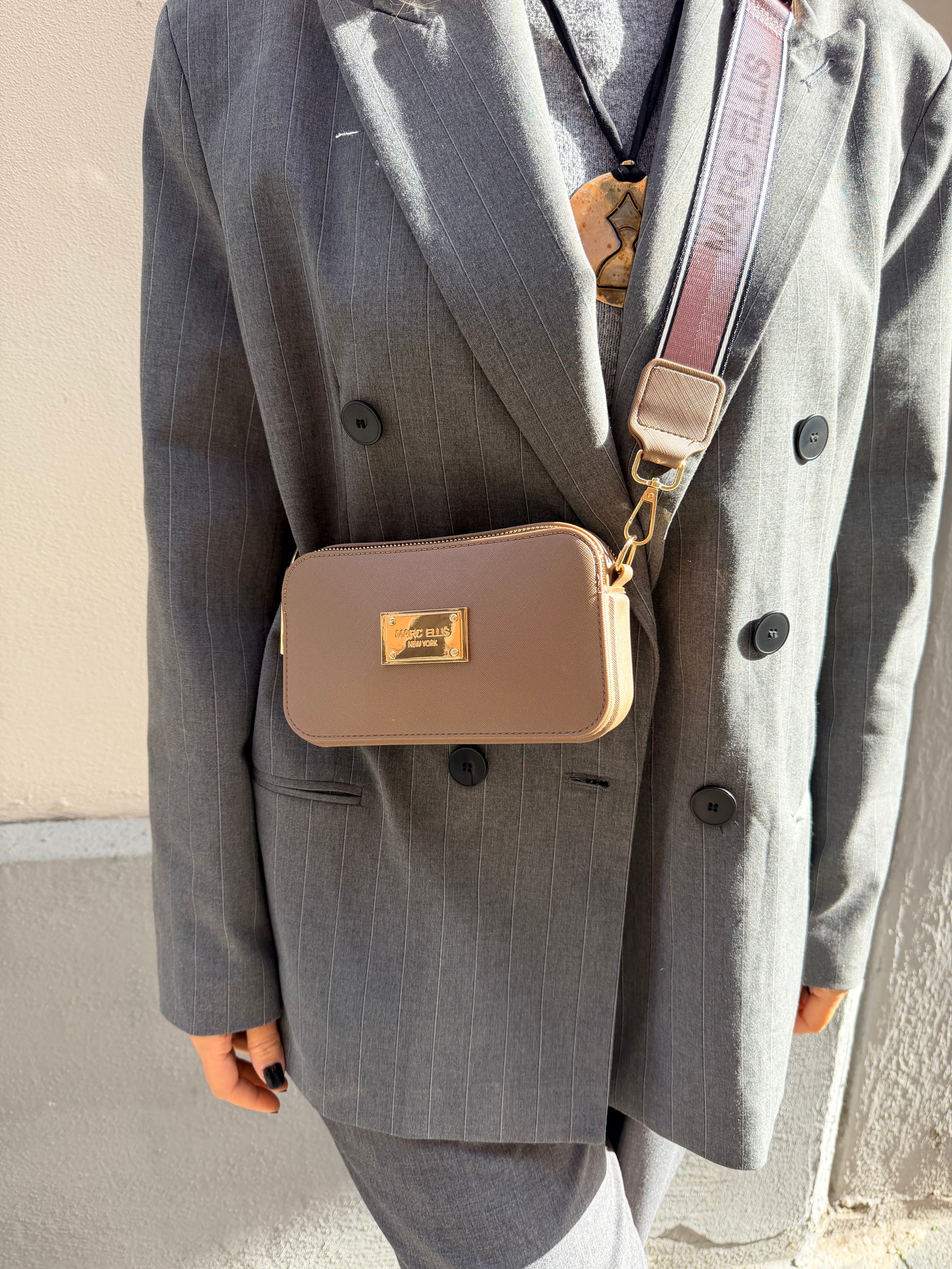 Borsetta in saggiano con doppia cerniera e tracolla in tessuto regolabile