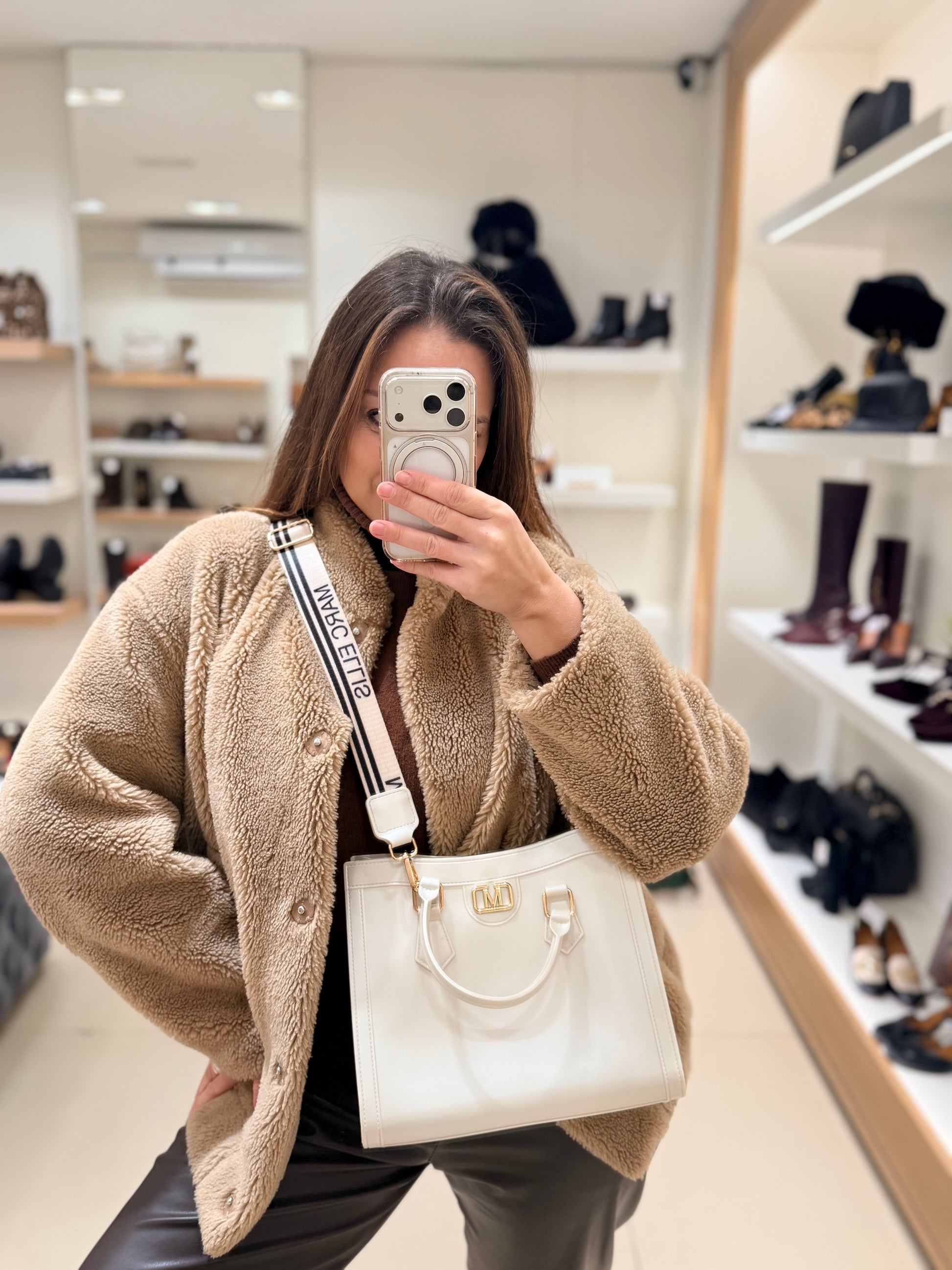 Borsa gommata burro con dettagli dorati e tracolla in tessuto regolabile