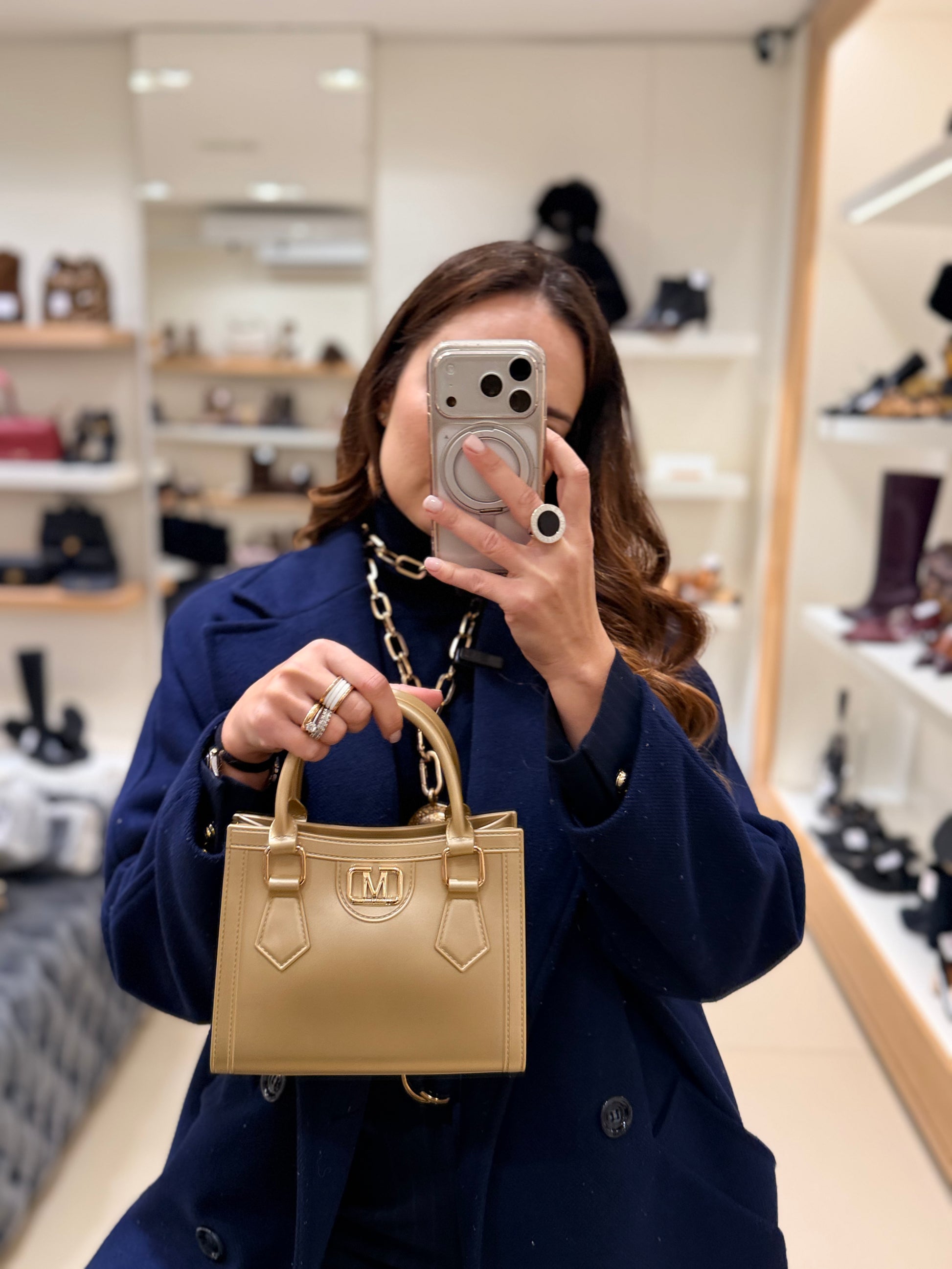 Borsa gommata dorata con tracolla in tessuto regolabile