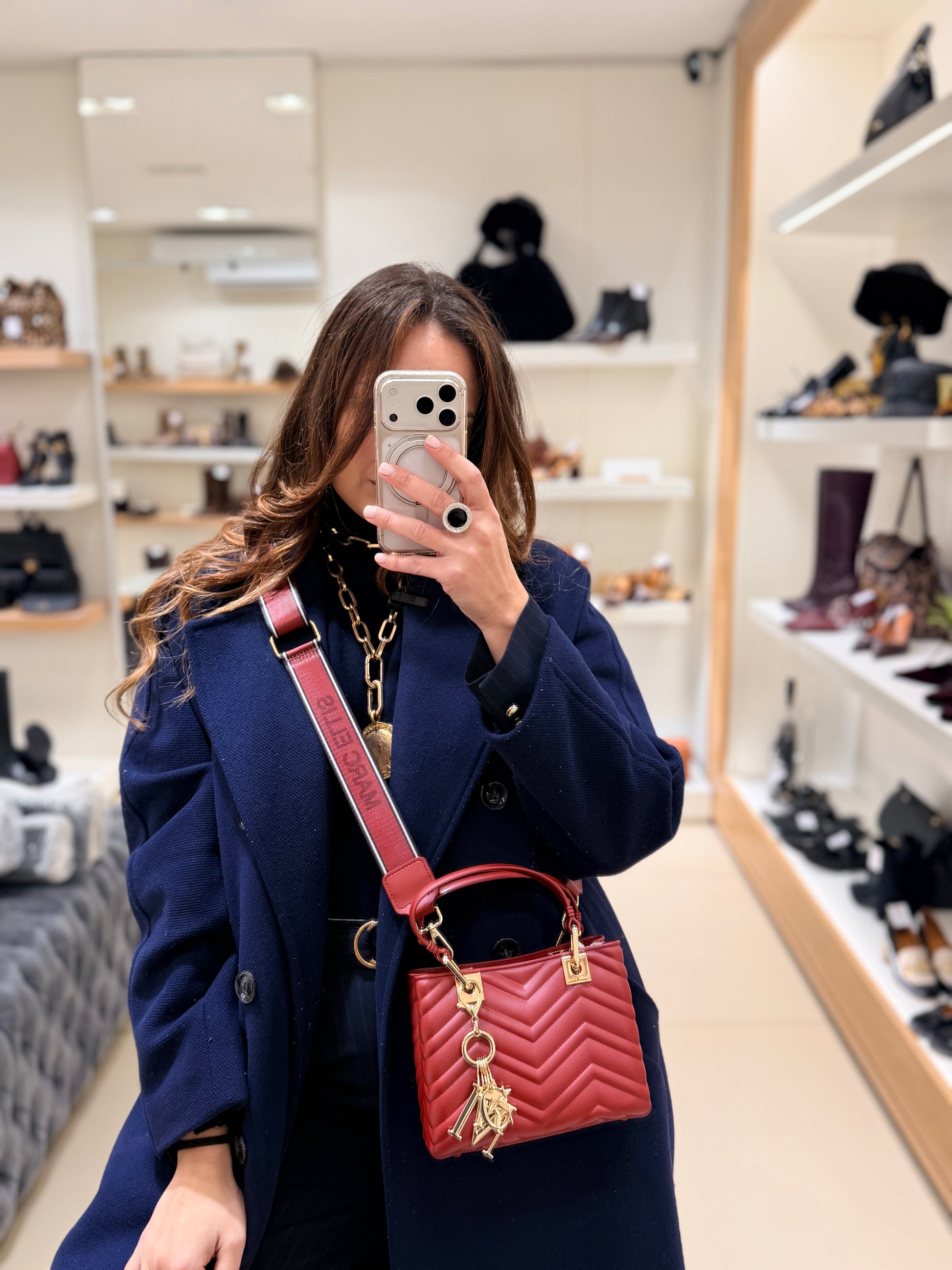 Borsa gommata rossa con portachiavi esterno e tracolla in tessuto regolabile