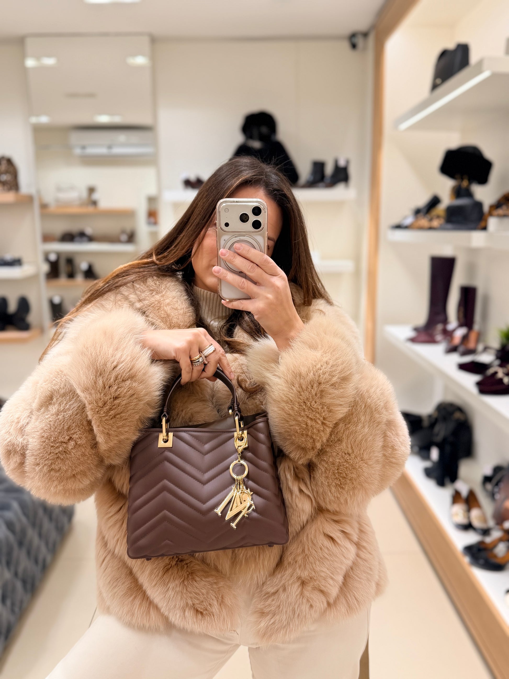 Borsa gommata marrone con dettagli dorati e tracolla in tessuto regolabile