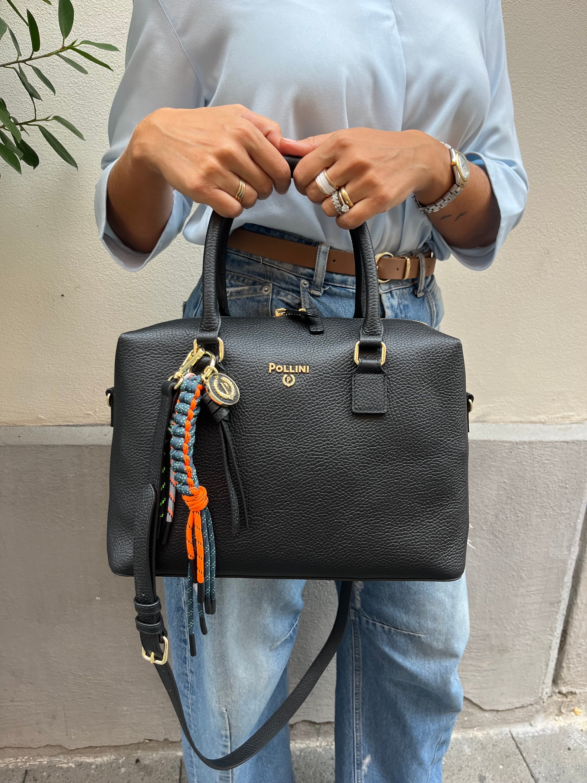 Borsa bauletto in pelle nera con portachiavi esterno