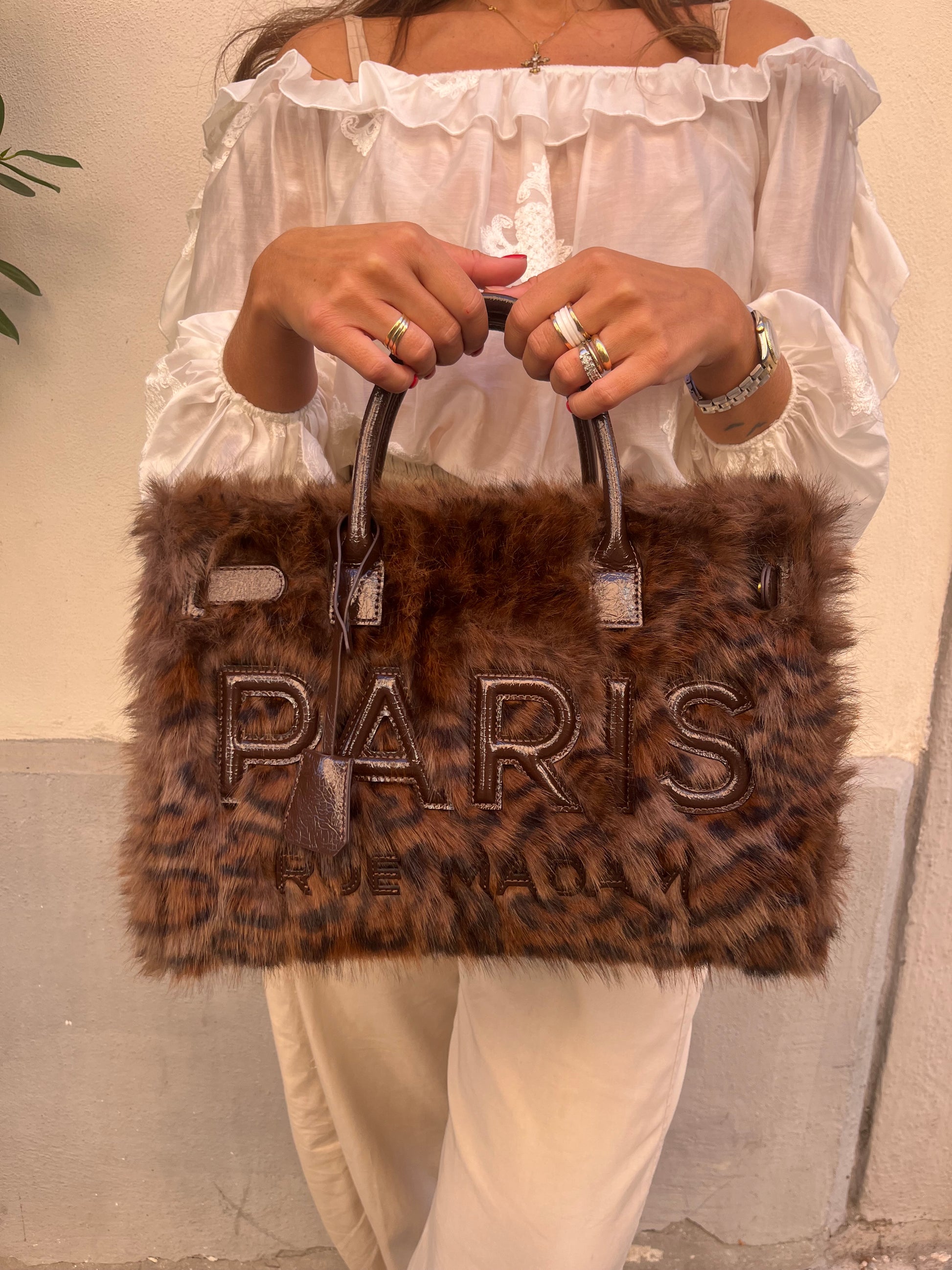 Tote Bag in ecopelliccia animalier con logo PARIS, manici e dettagli in Naplak. Soffietti laterali e chiusura con zip. Tracolla removibile e fodera interna in cotone con tasca. L 37 H 26 P 18