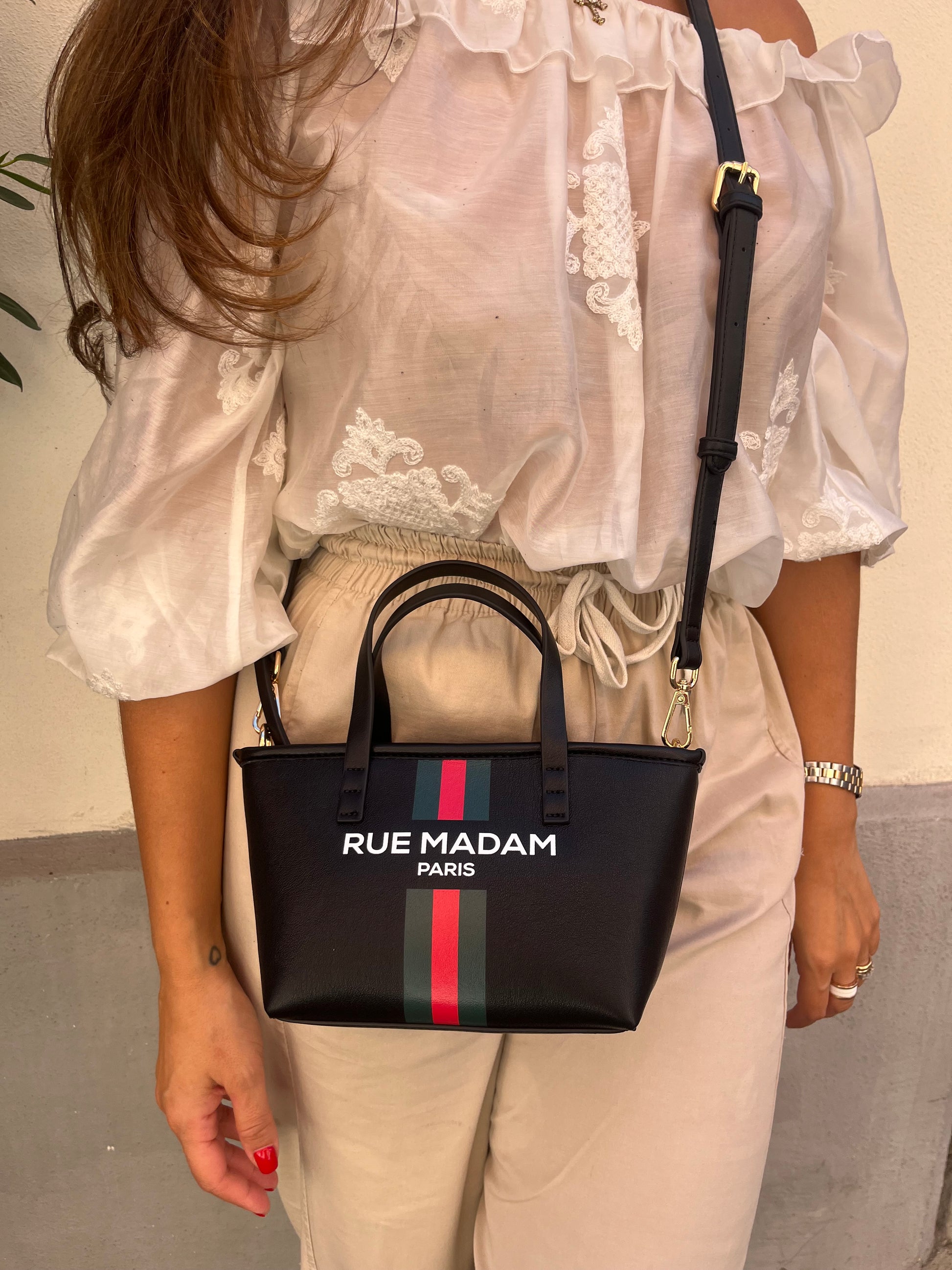 Mini Shopping bag in morbida ecopelle con stampa tricolore e dettagli con l'iconico pattern monogram RM. Chiusura con zip, tracolla removibile e fodera interna in cotone con tasca. L 26 H 14 P 11