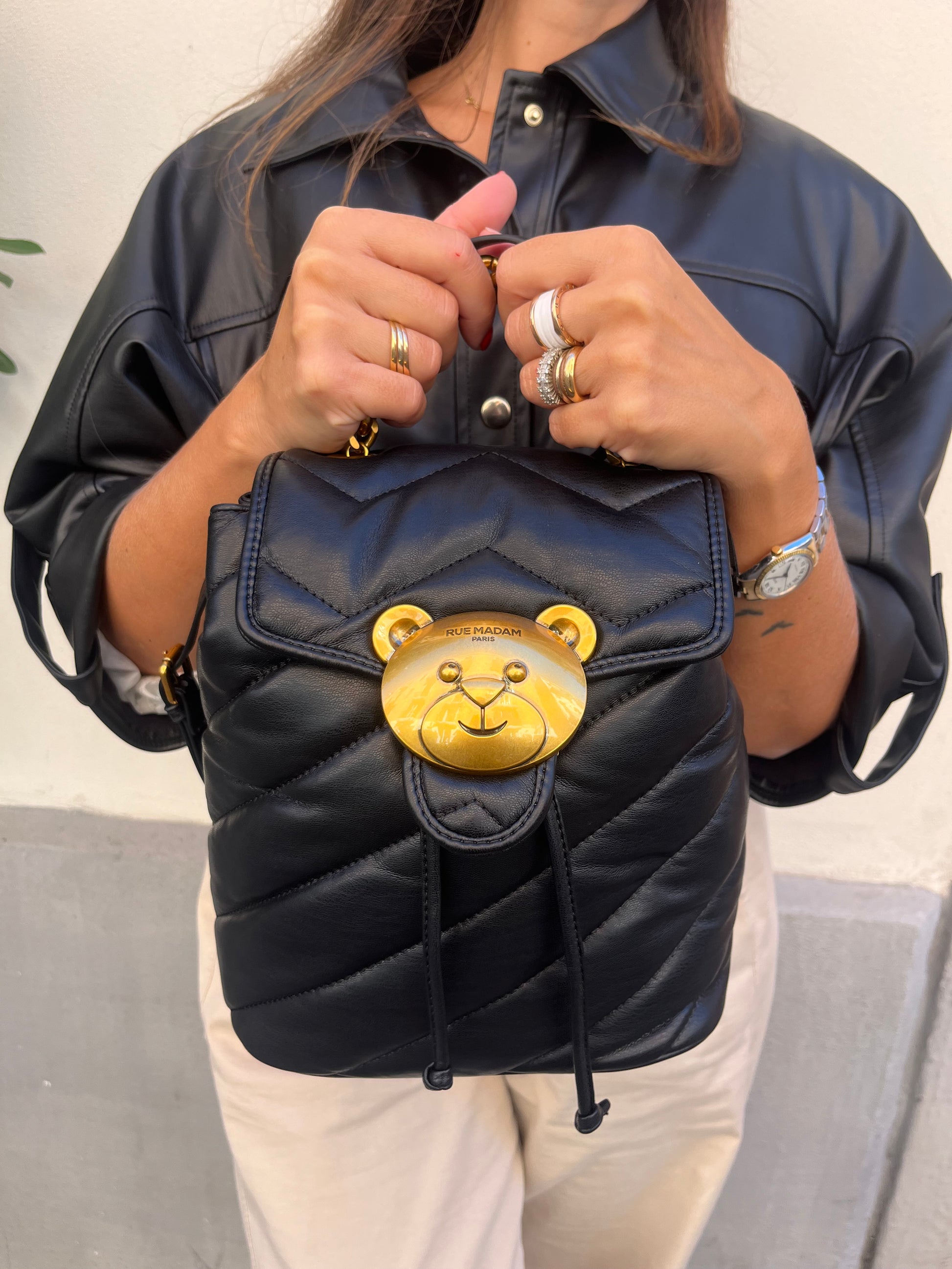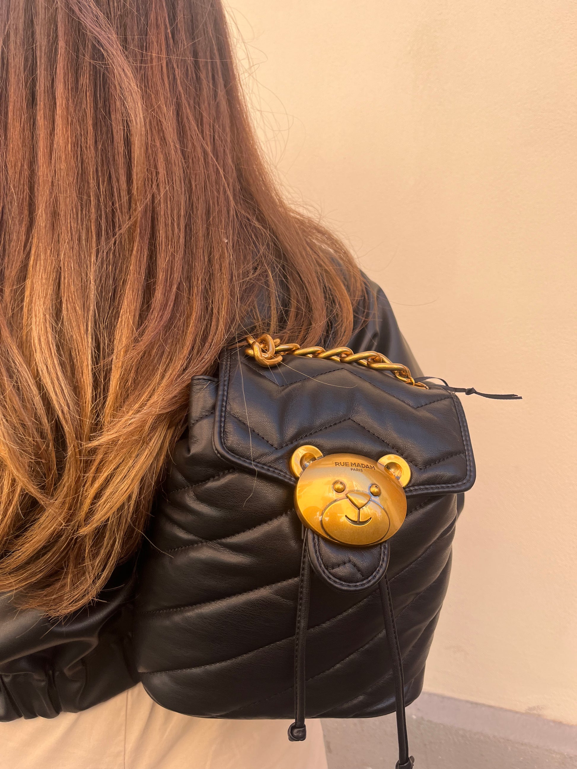 Zaino puffy in morbida ecopelle con trapuntatura. Chiusura magnetica con orsetto e manico in catena effetto invecchiato. Spallacci regolabili e fodera interna in cotone con tasca. L 23 H 25 P 13